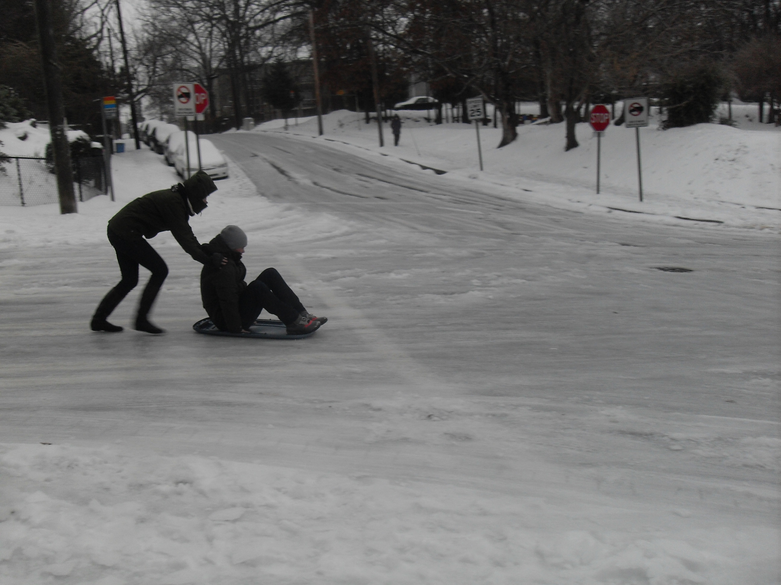 The inner 8 year old is singing that upbeat jolly version but the 30+ year old me is singing it with loads of toil and struggle. But I continued on because I haven’t seen the gym in months and this was proving to be a necessary workout. More people have walked on this particular sidewalk further up the block so I’m using their shoeprints to aid my walk but still each step requires concentration and at this point my legs hurt. My opportunity to rest came at the next intersection with the following couple trying to turn a trash lid into a sled. Not pictured is the bottle of vegetable oil they used to lubricate the lid.