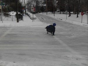 Now I’m ready, I’ve got the groceries hanging on my left arm, umbrella doubling as a walking stick in my right hand, hat pulled down, jacket zipped up, and away I go crunching through the ice and snow. I’m making good time and I’m finding the trip back a little easier even with the added weight of the groceries I didn’t really need. I’m smiling at passers-by and have joined in chorus with the inner 8-year-old with the “Tramping Thru The Snow” song and everything is great until I got back to the iced over intersection. I stood on the corner for a moment and devised a game plan. The intersection was on a hill slanting left so I put the groceries on my right arm and the umbrella/walking stick in my left hand; if I started to slide left down the hill I could plant it in the ice and stop the slide. I took a deep breath and started to go but just as I got my nerve to step off the curb onto the street dressed as an ice rink I see a group of people coming up the street laughing and taking silly pictures; immediately I have to reevaluate this situation. If I step into this street with two bags of groceries on my arm and I fall and slide into the middle of this intersection in front of a group of people armed with camera I’m likely going to be on YouTube when I wake up in the morning. So, armed with a camera of my own I snap a few pictures of the scenery around me and wait for the group to pass. But they don’t, they have chosen the corner across from me as their posing spot. 3-4 minutes have passed, they are still there being silly and snapping pics, laughing as they try to make snow angels but they can’t because they can’t break through the ice on top of the snow. It’s starting to sleet a little at this point and the wind is picking up and I’m getting cold, so I throw caution to the wind and step off the curb.