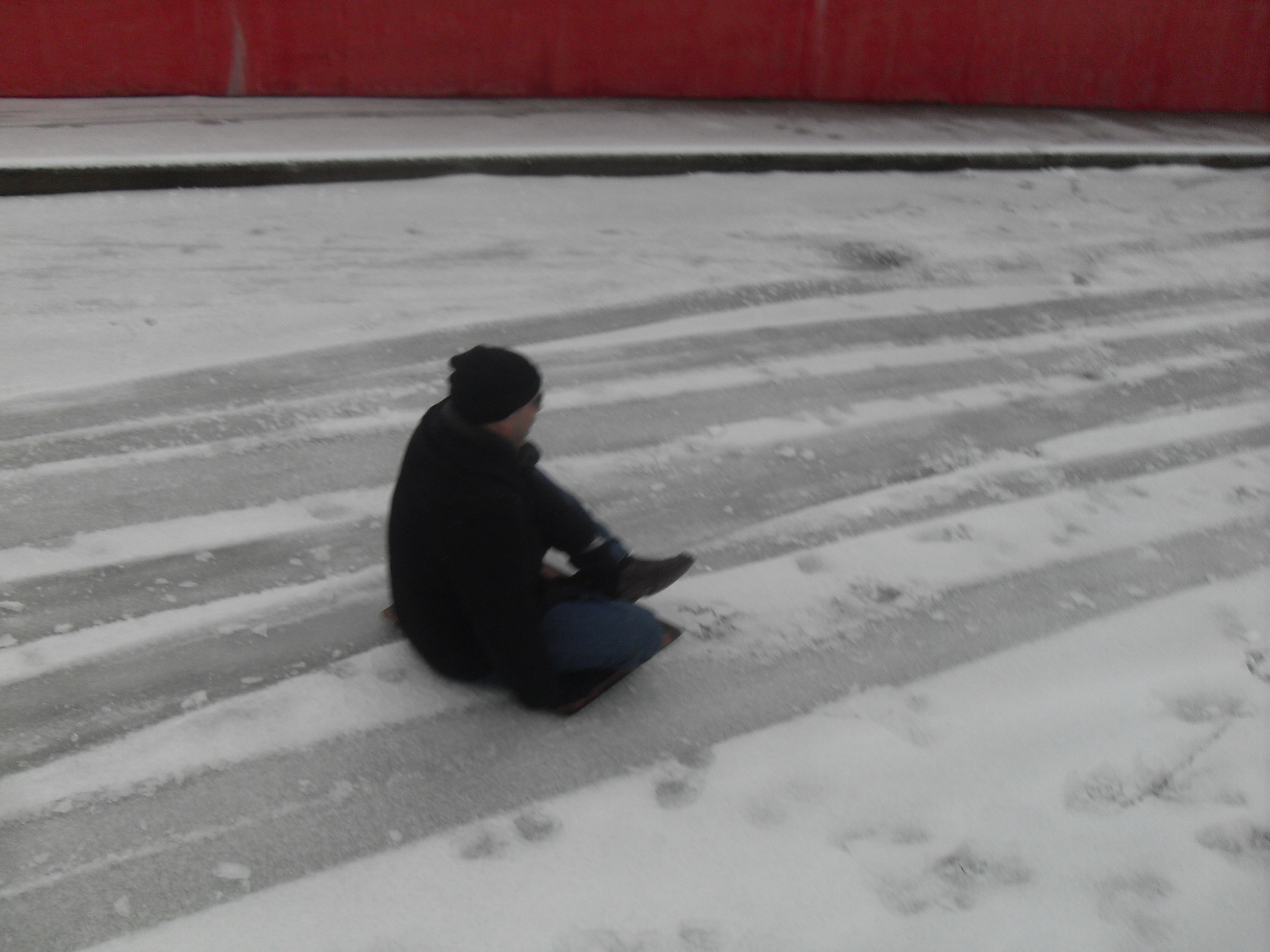 While I’m standing on the corner watching these two the smell of brownies is coming from the house on the corner and the inner 8 year old inside me starts doing back flips. “Brownies!!!” The 30+ year old me tries to make a stand “No! We don’t have brownie mix at the house, we don’t need brownies.” The inner 8 year old retorts, “But the grocery store is less than half a mile away. Pleeeeeease?” Then I started to think, “I really would like some chili today and the store IS just up the way. Why not?” So I pulled my hat down over my ears as my inner kid cheered and I stepped into the intersection, the same intersection covered in a sheet of ice that people were currently sledding on and I….didn’t fall, not yet anyway. But this lady did…