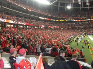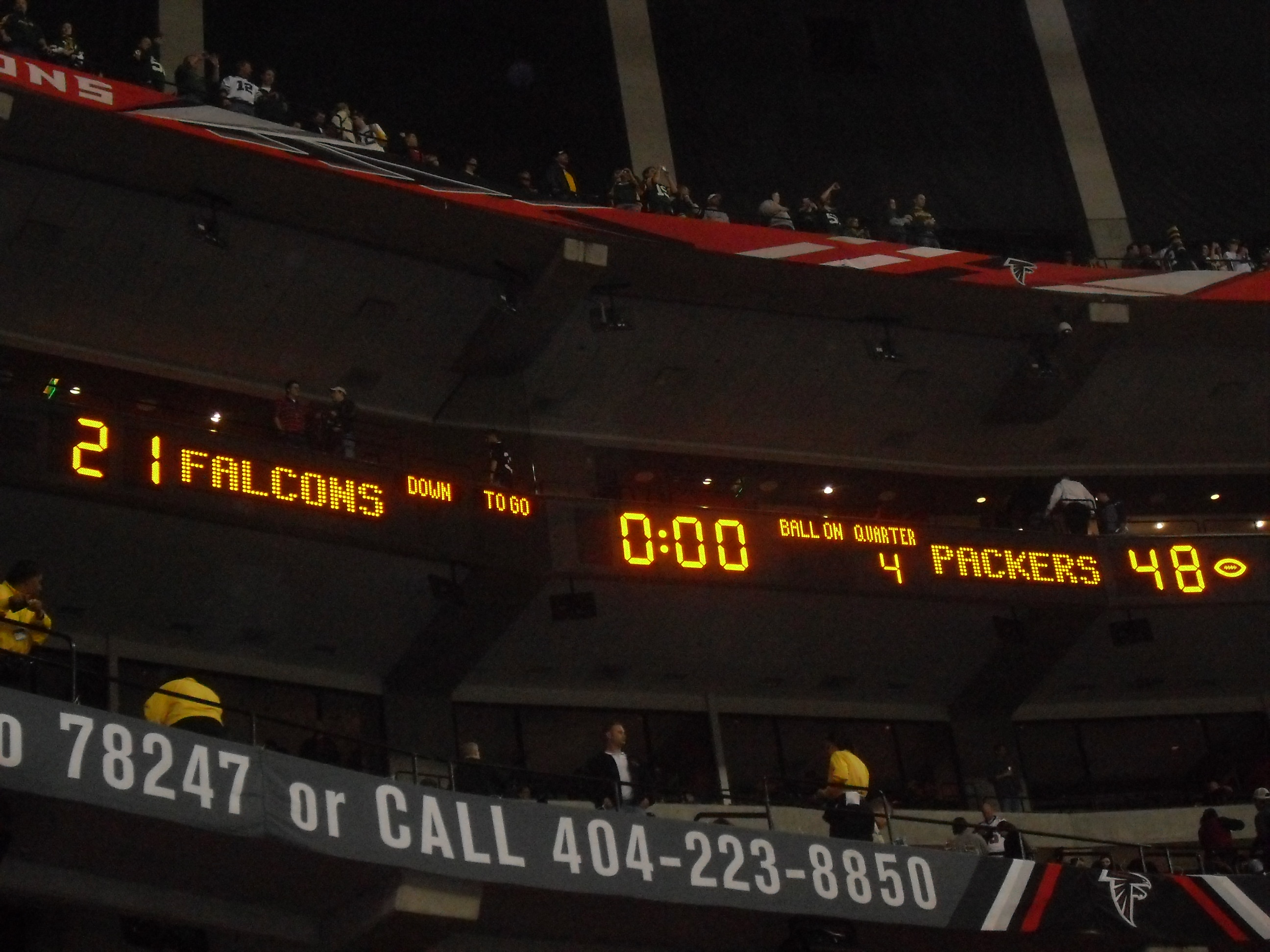 Then they score, then we return the kickoff for a score and then that’s when the night went real bad real quick on the field and in the stands. The Packers start going all PlayStation on the Falcons defense, the Falcons start going all Little League football, turnovers, mishaps, embarrassments; everything they do is very right, everything we do in horrifically wrong and I start to wonder aloud if they even have a punter. Then a Packer fan gets hauled out of our section for slicing cheese (with a knife, it’s against the rules for weapons of any kind in the stadium)and handing it out to other Packer fans in the section. People get unruly, a dude 5 rows behind me calls me “boy” and that’s why you don’t see any more pictures because for the next 2 quarters I’m seeing red (not Falcons red this time) wanting to stomp a hole in the chest of the guy. The one time I needed to be rolling with some of my unseemly associates to do some facial damage to a redneck Packer fan I go to the game with my educated friend that calmly talks me off the ledge and keeps me from doing something stupid…Thanks, dude. I appreciate it, but you have to admit, dude would have had it coming.