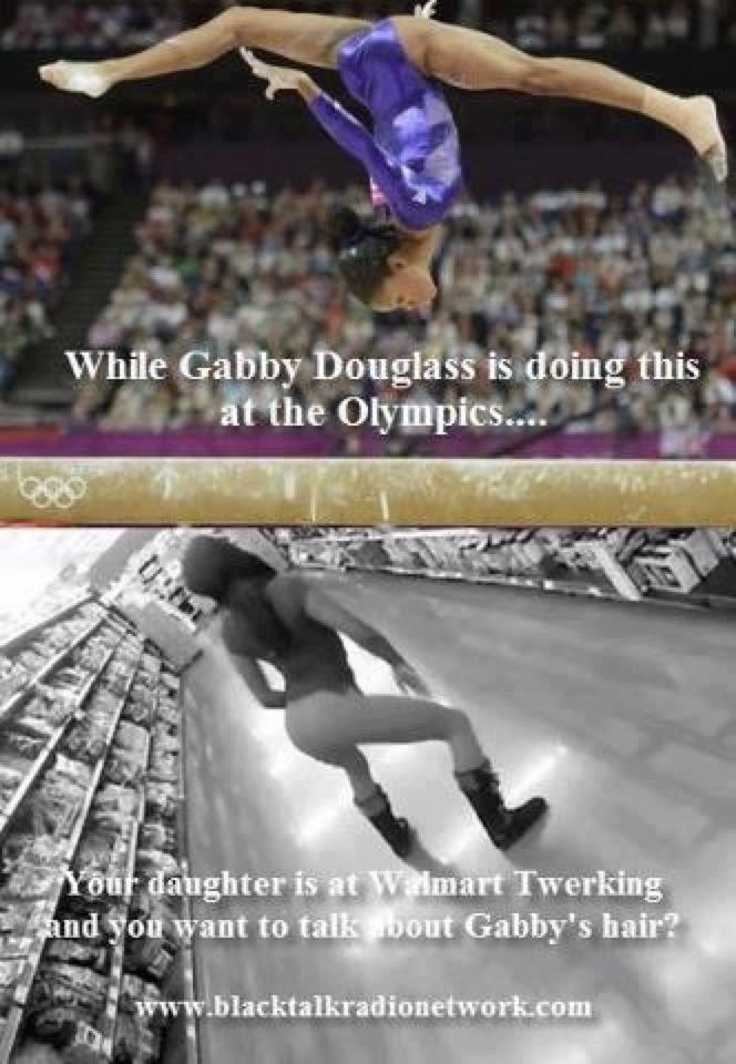 …as if the greatness and achievements of one of our daughters gives us license to point fingers and ridicule the folly of another of our daughters! HA! Is it stupid to talk about a world class athlete’s hair? Absolutely, about as stupid as it is for someone to then say, “well, yo’ daughter is somewhere out on the ho stroll selling booty” in Douglas’ defense.